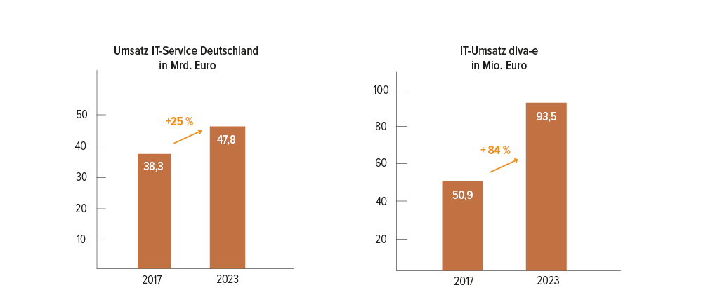 Dies beschleunigte das Wachstum mit der Folge, dass sich diva-e stärker als der Gesamtmarkt entwickelte. Während der Umsatz der Digitaldienstleistungsbranche zwischen 2017 und 2023 um rund 25 Prozent zulegte, wuchs diva-e in dieser Zeit um mehr als das Doppelte (siehe Grafik). Auf dieser Basis stehen bis heute namhafte, international agierende Unternehmen wie beispielsweise ALDI Süd, EDEKA, E.ON, Carl Zeiss, dmTECH, ZF Friedrichshafen und Bentley auf unserer Kundenliste