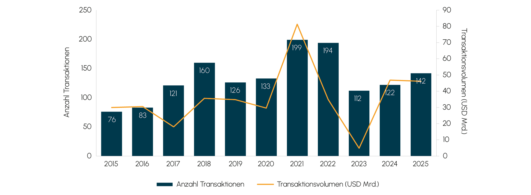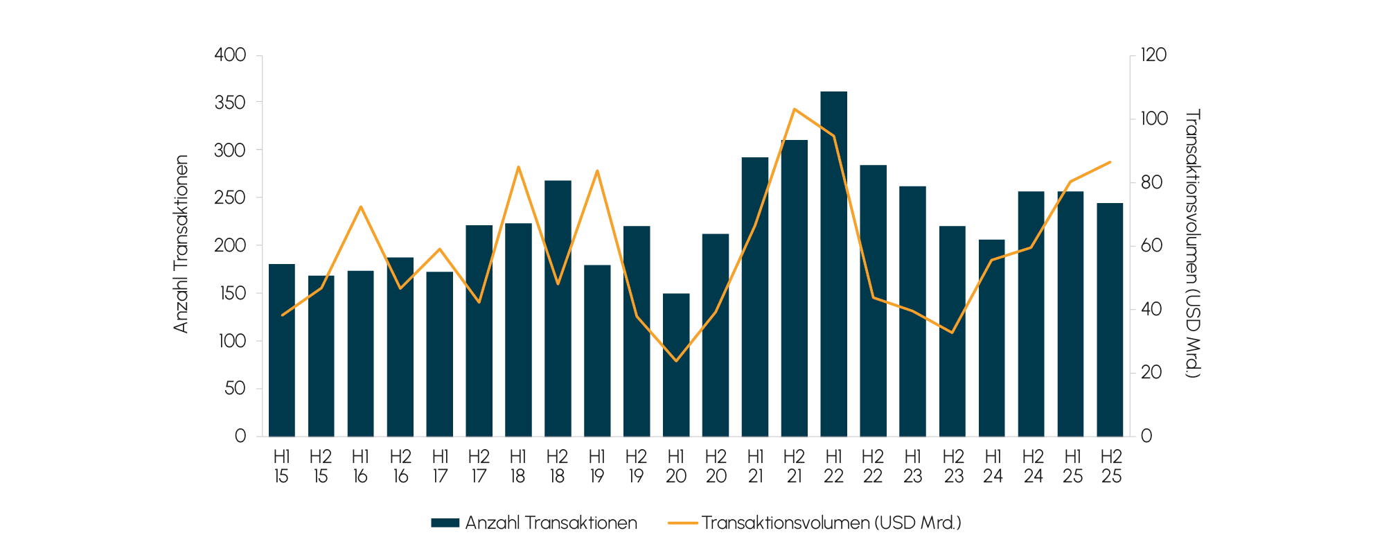 Ein Blick auf die Entwicklung über das Jahr zeigt ein insgesamt ausgewogenes Bild (siehe Abb. 1). Im ersten Halbjahr 2025 wurden 257 Deals angekündigt, mit einem offengelegten Transaktionsvolumen von rund 80,3 Mrd. USD. Das zweite Halbjahr lag bei der Deal-Anzahl leicht darunter (245 Deals), übertraf das erste jedoch beim Volumen mit rund 86,5 Mrd. USD. Zudem zeigen die Zahlen, dass sich die Aktivität über das Jahr zwar stabil hielt, der Markt aber weiterhin von einzelnen größeren Transaktionen geprägt blieb.