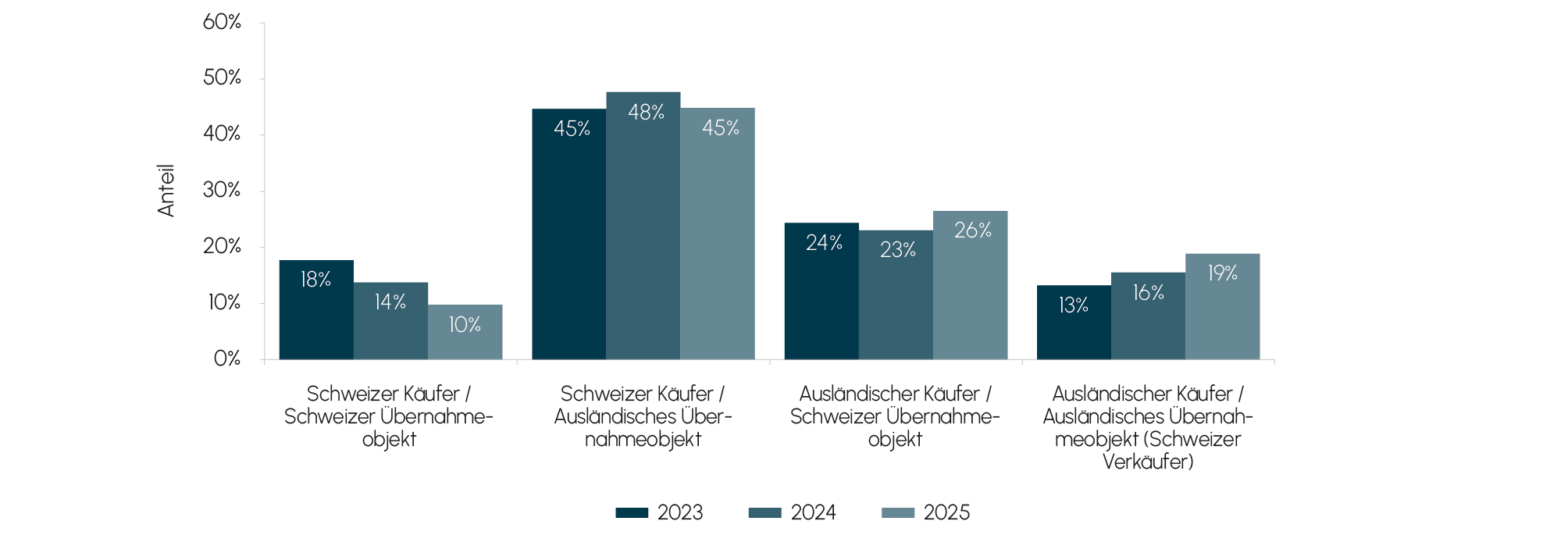 Abb. 5 Anteil der Transaktionen nach Art der Schweizer Beteiligung (2023 bis 2025)