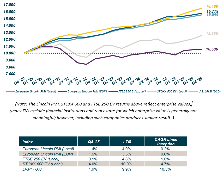 Der europäische Lincoln Private Market Index (PMI) ist um 1,4% im vierten Quartal 2025 gewachsen. Treiber des Wachstums war dabei aber eher die positive Entwicklung der Unternehmen als die der EV-Multiples.