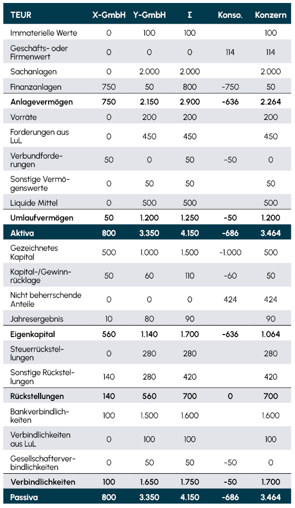 Der Beispielkonzern besteht aus der X-GmbH und der Y-GmbH, wobei die X-GmbH zu 60% an der Y-GmbH beteiligt ist. Die Konsolidierung basiert auf den handelsrechtlichen Grundsätzen (Vollkonsolidierung).