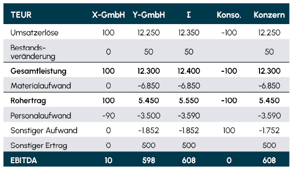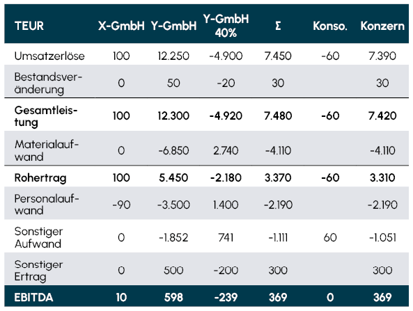 Im Konzernabschluss werden sämtliche Vermögensgegenstände und Verbindlichkeiten sowie Erträge und Aufwendungen, unabhängig von der tatsächlichen Beteiligungsquote, so erfasst, als würde die X-GmbH 100% der Anteile an der Y-GmbH halten. Die Ergebnisgrößen der Gewinn- und Verlustrechnung, wie beispielsweise das EBITDA, werden so präsentiert, als ob diese wirtschaftlich vollständig den Gesellschaftern der X-GmbH zuzurechnen sind.