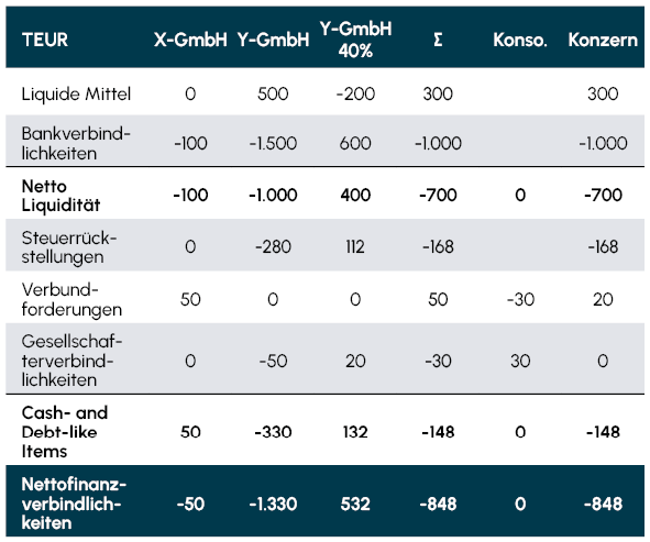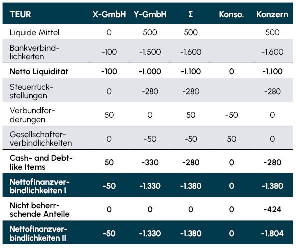 In der Eigenkapitalbrücke werden sämtliche Bilanzposten, die den Nettofinanzverbindlichkeiten zuzurechnen sind, vollständig erfasst. Dies bedeutet, dass diese bei Bezugnahme auf die Bilanzposten gemäß Konzernabschluss unabhängig von der Höhe der Beteiligung vollständig in die Eigenkapitalbrücke einbezogen werden. Für den Beispielkonzern resultieren hieraus Nettofinanzverbindlichkeiten in Höhe von 1.380 TEUR.