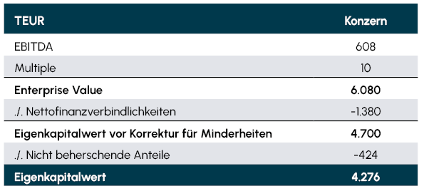 Das EBITDA des Konzerns beträgt bei Durchführung einer Quotenkonsolidierung 369 TEUR. Die Differenz von 239 TEUR zum handelsrechtlichen Konzern-EBITDA resultiert aus dem anteiligen Abzug der Erträge und Aufwendungen, die den Minderheiten zuzurechnen sind. Unter der Annahme eines EBITDA-Multiplikators von 10 ergibt sich für den Beispielkonzern ein neuer Unternehmenswert von 3.690 TEUR.
