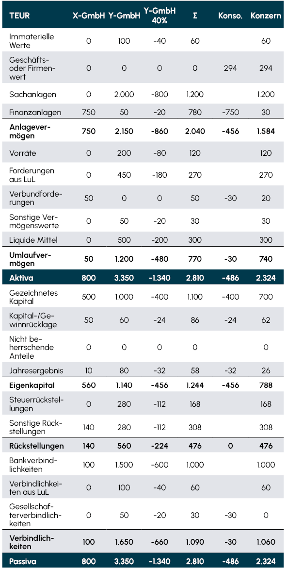 Die Anwendung einer Quotenkonsolidierung stellt eine alternative (betriebswirtschaftliche) Herangehensweise zur handelsrechtlichen Rechnungslegung dar. Hierbei werden die Vermögensgegenstände, Verbindlichkeiten sowie Erträge und Aufwendungen der Y-GmbH entsprechend der Beteiligungsquote proportional erfasst. Dadurch entfällt eine separate Ausweisung der nicht beherrschenden Anteile im Eigenkapital.