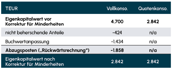 Das ökonomische Gesetz eines Preises vorausgesetzt, kann über die Differenz der Eigenkapitalwerte bei Anwendung der Vollkonsolidierung vor Berücksichtigung eines Abzugsposten für Minderheitenanteile einerseits und Anwendung der Quotenkonsolidierung (Abkehr von handelsrechtlichen Rechnungslegungsvorschriften) andererseits implizit die Höhe des Abzugsposten beziffert werden („Rückwärtsrechnung”), welcher berücksichtigt werden sollte, sofern bei der Ermittlung des Unternehmenswerts auf einen Konzernabschluss zurückgegriffen wurde.