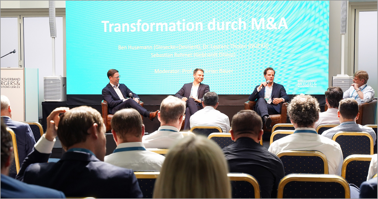 Im letzten Panel vor dem Galadinner ging es um Transformation in Familienunternehmen und die Rolle von M&A dabei. So ist es beispielsweise für Giesecke+Devrient nahezu immanent wichtig, das Geschäft über Zukäufe zu digitalisieren. Bei dem Hersteller unter anderem von Banknoten und Ausweisen liegt der Fokus auf Hardware, doch die Digitalisierung der Gesellschaft bringt signifikante Änderungen auch in der Sicherheitstechnik und -technologie mit sich, was Transformationen unentbehrlich macht. Einen wichtigen Punkt nannten auch die Teilnehmer dieses Panels: Für erfolgreiche Prozesse müssen die Mitarbeiter mitgenommen werden, sie brauchen den sprichwörtlichen Nordstern, der sie leitet und ihnen auch Ziele und Visionen vermittelt. Und sie brauchen Verständnis seitens des Managements, sollte es zu Interessenkonflikten oder Missverständnissen kommen. Das gelte für die Transformation wie für M&A gleichermaßen.