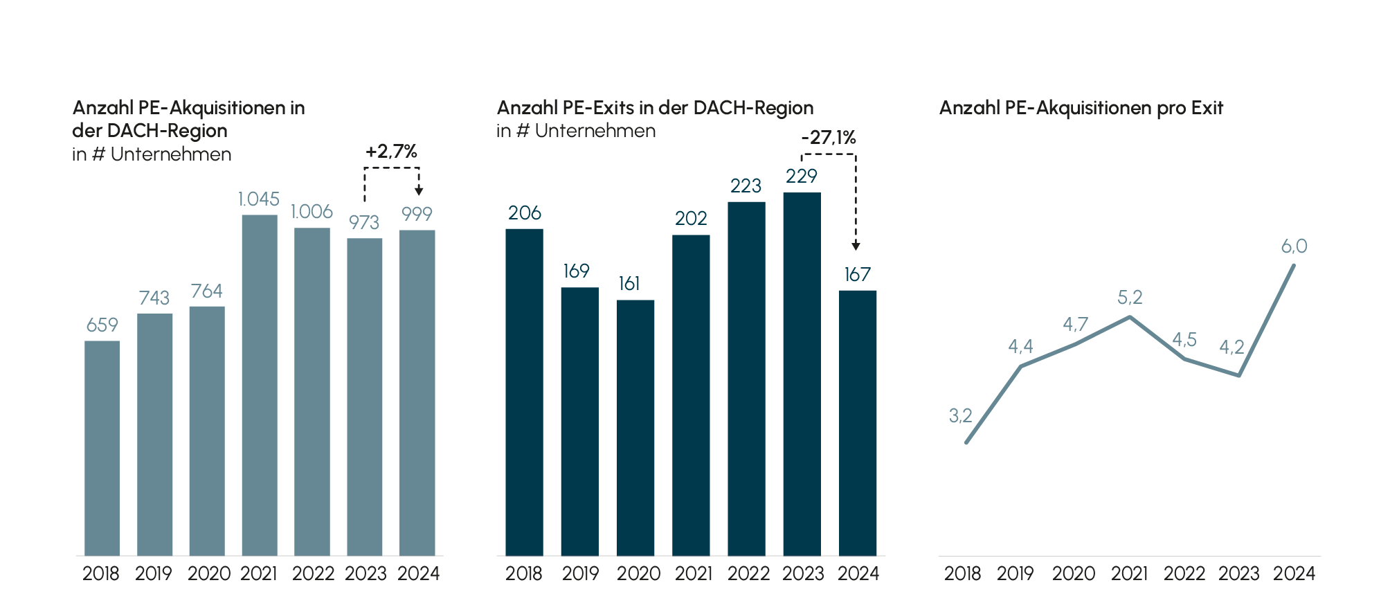 Die Private-Equity-Aktivität in der DACH-Region zeigt in den vergangenen zwei Jahren ein differenziertes Bild: Auf der Buy-Seite steigt die Zahl der Transaktionen leicht um 2,7% von 2023 auf 2024, während die Sell-Seite stark rückläufig ist – Private-Equity-Exits sinken um 27,1%. Das Verhältnis von Akquisitionen pro Exit erhöht sich damit von 4,3 auf 6,0. Investoren reagieren vorsichtiger auf ein Marktumfeld, das von Unsicherheit und Volatilität geprägt ist.