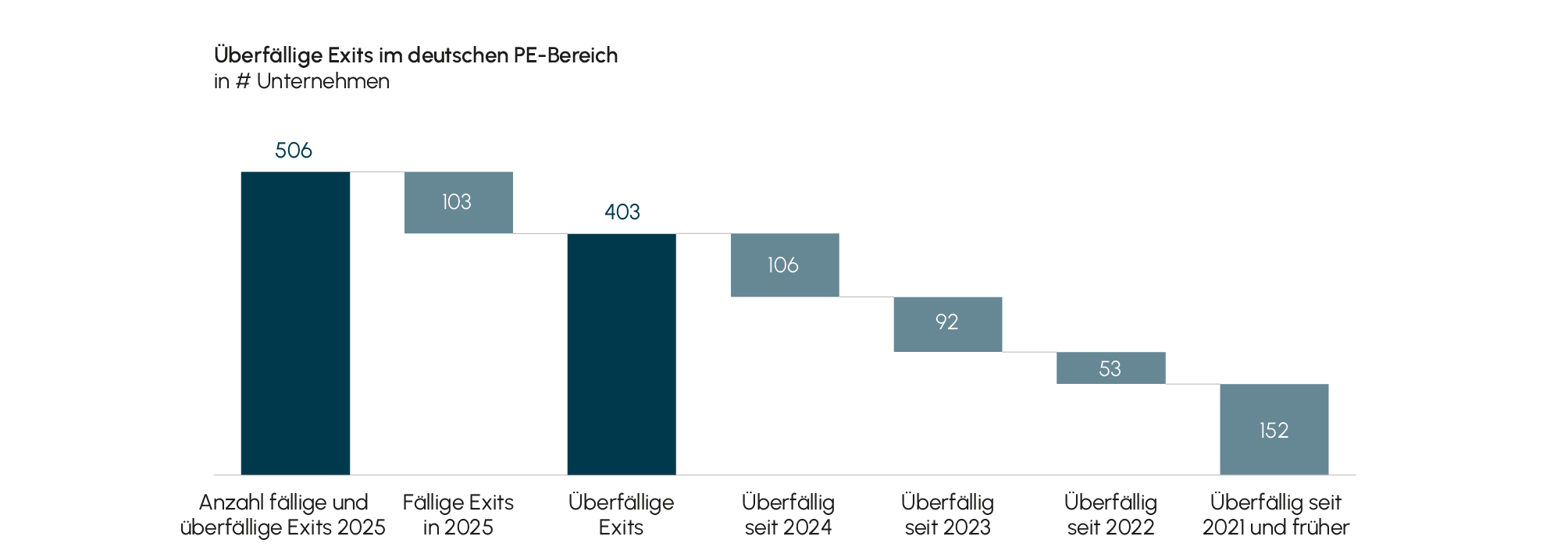 Die Überfälligkeit verteilt sich über mehrere Jahre: Einige Unternehmen hätten bereits 2024 den Exit vollziehen sollen, andere warten seit 2023 oder sogar seit 2022 und früher. Dieser Rückstau verdeutlicht, dass sich der Exit-Markt zunehmend verlangsamt und Fonds Beteiligungen länger halten als ursprünglich geplant.