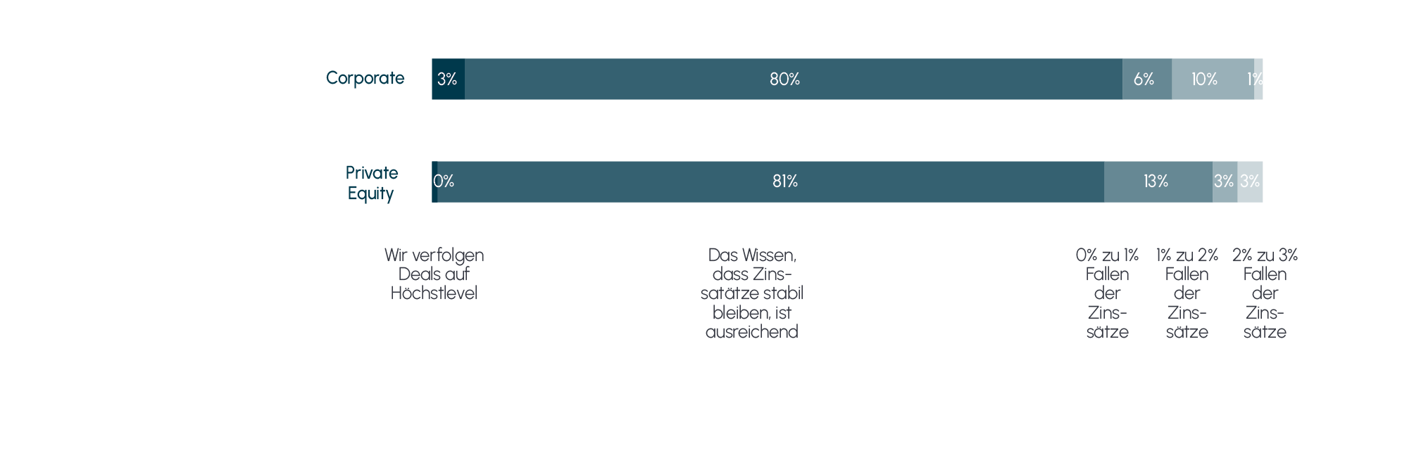 Obwohl die Deal-Aktivität voraussichtlich steigen wird, bleiben die Marktbedingungen, die die Deal-Entscheidungen prägen, weiterhin in einigen Bereichen herausfordernd, wenngleich besser als im Jahr 2024. Volatile Zinsentwicklungen in den letzten Jahren haben den Wunsch nach Stabilität und Vorhersehbarkeit geschürt. Die überwiegende Mehrheit betrachtet das aktuelle Zinsniveau als akzeptabel und sieht stabile Zinssätze in naher Zukunft als positive Entwicklung. Ein stabiles und vorhersehbares Zinsumfeld würde dazu beitragen, den Markt zu stabilisieren und möglicherweise die Preiserwartungslücke zwischen Käufern und Verkäufern zu verringern.