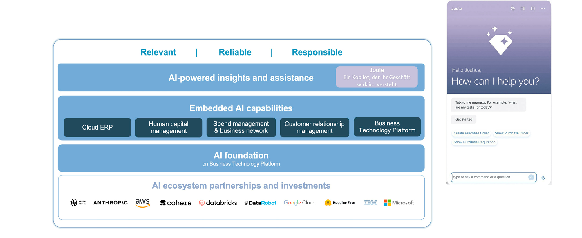 Der digitale Assistent Joule unterstützt bei der Durchführung komplexer Aufgaben, indem er Anfragen beantwortet, analytische Inhalte liefert und auf Anwendungsfunktionalität direkt verweisen und interagieren kann.