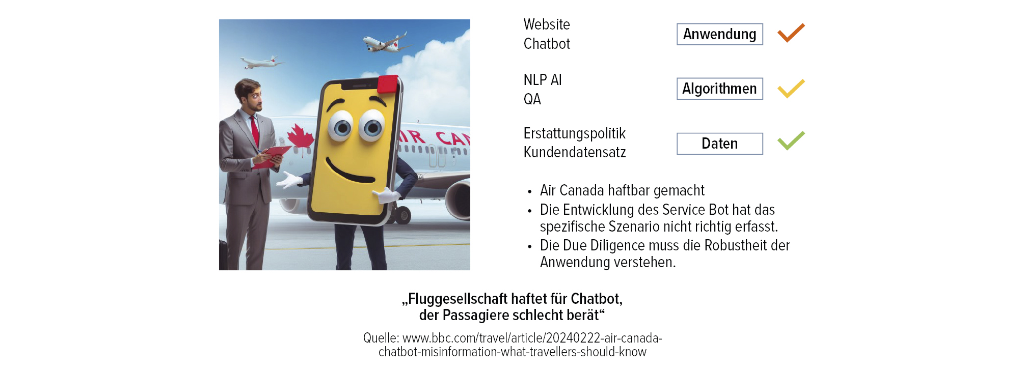 Ein Beispiel ist ein Vorfall bei Air Canada, bei dem ein ChatBot einem Kunden eine Erstattung seines Flugtickets zugesagt hatte, obwohl die Voraussetzungen für eine Erstattung nicht zutrafen4. Die verwendeten Daten waren korrekt, aber die Algorithmen und die Anwendung haben diese falsch ausgewertet, was zu dem Vorfall führte. Dies zeigt, dass selbst bei einfachen Sachverhalten die Ergebnisse der GenKI falsch sein können und daraus Schaden entstehen kann. Das stellt wiederum die Qualitätssicherung von GenKI vor Herausforderungen, da mit ökonomisch vertretbaren Testaufwänden niemals alle möglichen, nicht-deterministischen Ergebnisse eines GenKI-Algorithmus getestet werden können.
