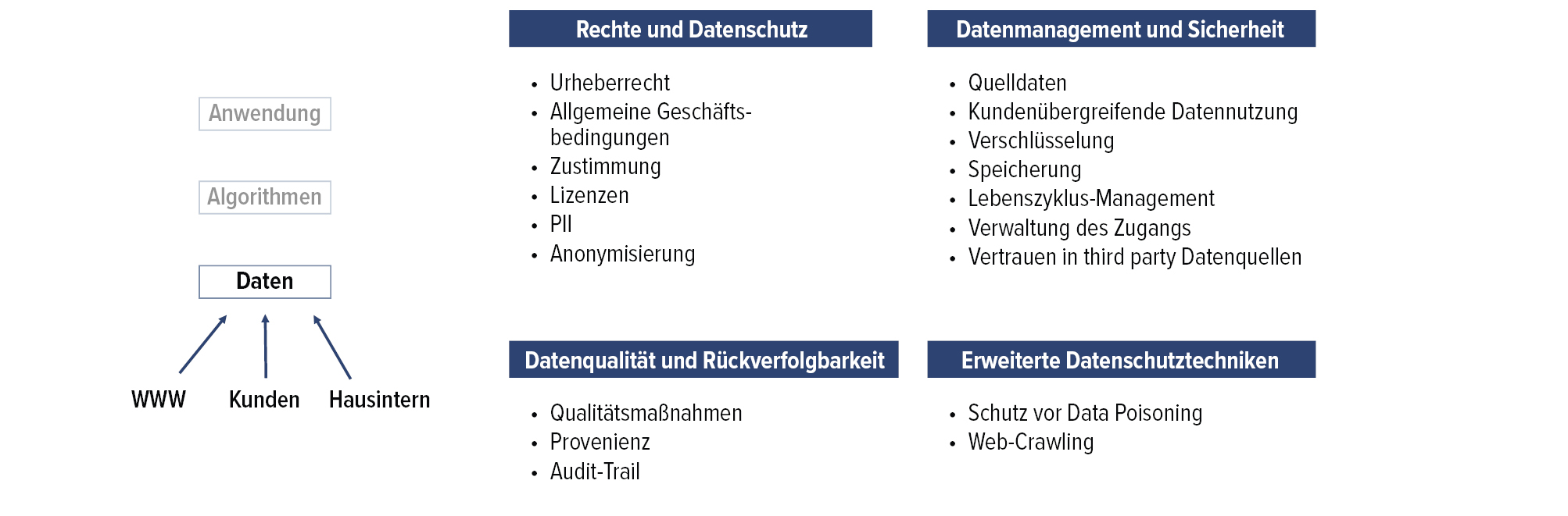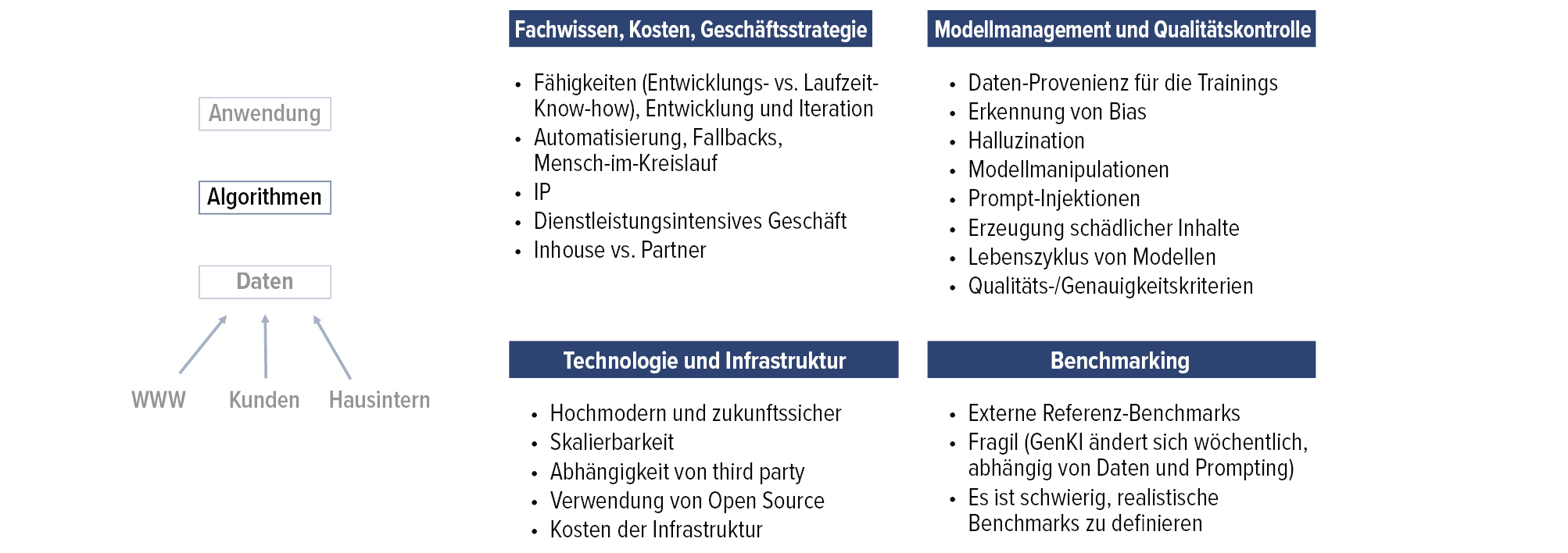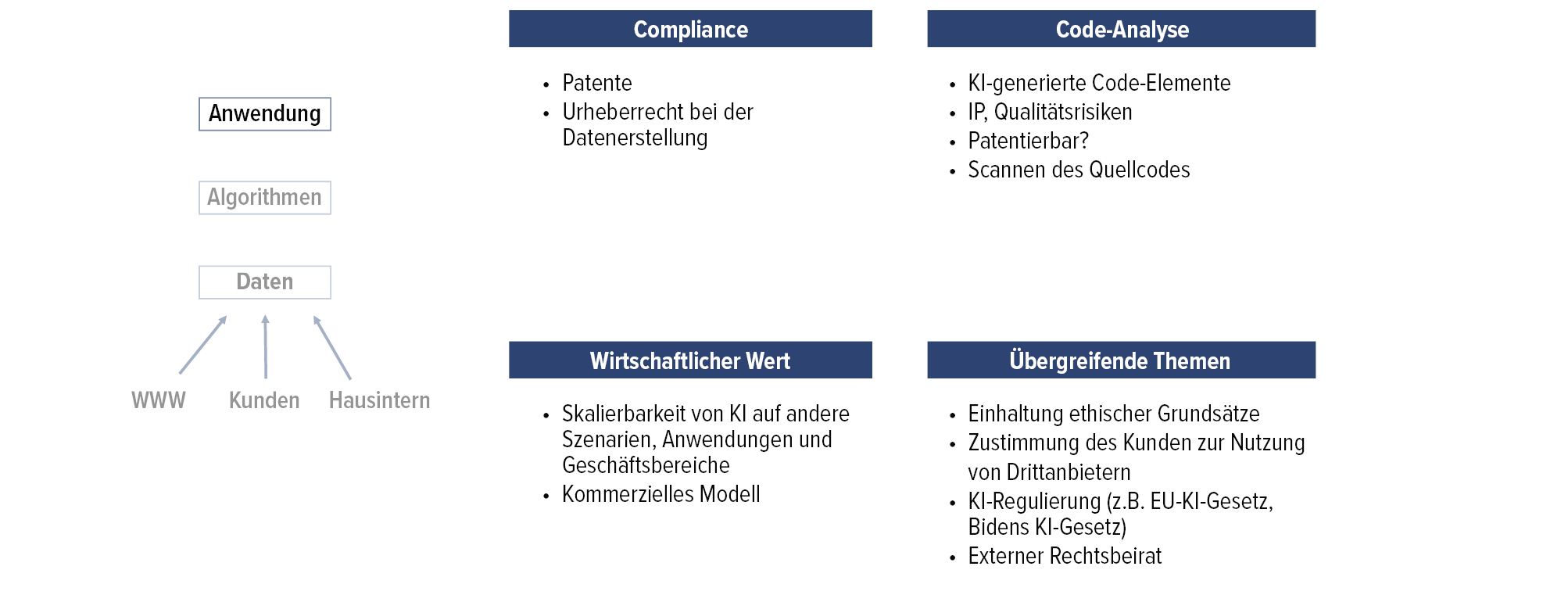 So wie die Firmen und Lösungen im Bereich GenKI häufig jung sind, so gering ist die Reife der Analyse und Bewertung von GenKI-Lösungen in der Due Diligence. Im Folgenden sollen Hindernisse der Bewertung nach drei Themenbereichen aufgezeigt werden: Daten, Algorithmen und Anwendungen.
