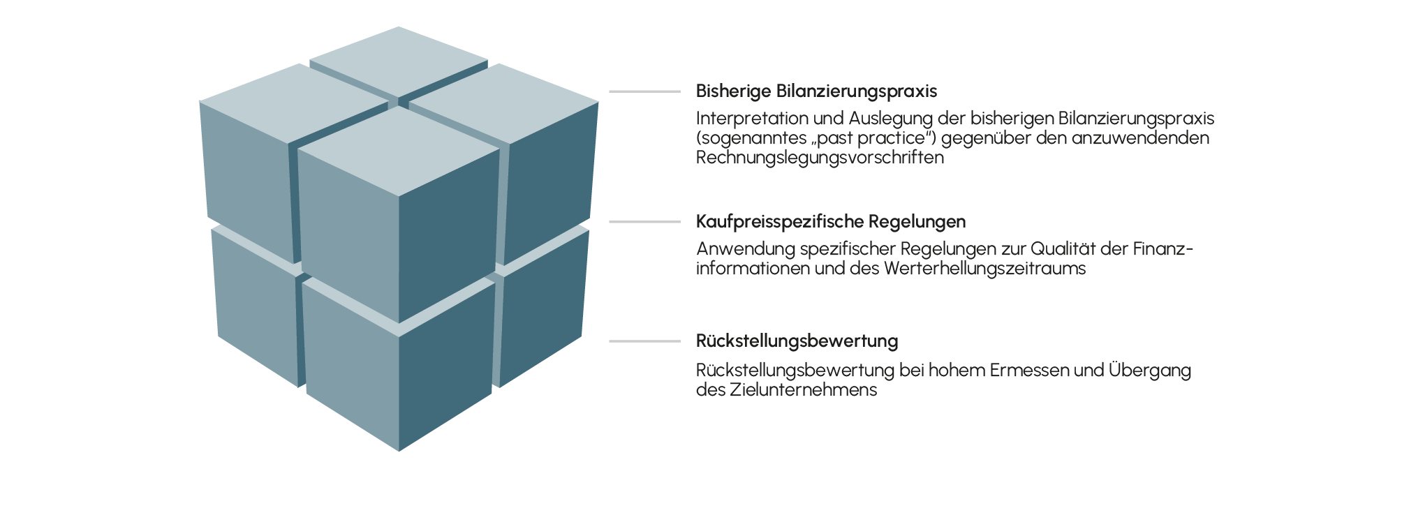 Verkäufer nehmen hierbei eher die Position ein, dass unabhängig vom Sachverhalt die bisherige Bilanzierungspraxis zwingend weiter anzuwenden ist, da eine solche Bilanzierungspraxis noch vom Verkäufer selbst gewählt wurde. Käufer hingegen gewinnen nach Übernahme des internen Rechnungswesens der Zielgesellschaft zumeist Detaileinblicke, die sie während der Due Diligence nicht gewinnen konnten. Diese neuen Informationen können dazu führen, dass ein Käufer die bisherige Bilanzierungspraxis als nicht angemessen erachtet und diese mit Effekt auf den Kaufpreis anzupassen wünscht.