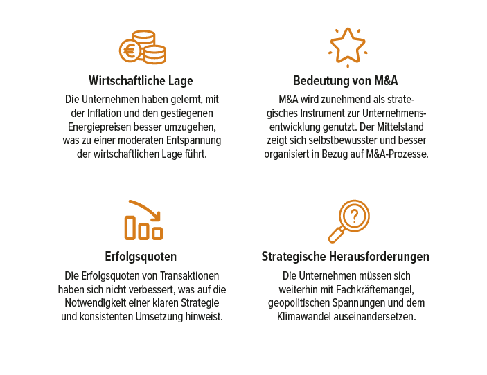 Die Studie bietet erneut wertvolle Einblicke in die aktuellen Herausforderungen und Strategien des deutschen Mittelstands. Trotz der bestehenden Schwierigkeiten zeigen die Unternehmen eine bemerkenswerte Anpassungsfähigkeit und Innovationskraft. M&A-Aktivitäten spielen eine zunehmend wichtige Rolle, wobei die Erfolgsrate stark von einer klaren und konsistenten strategischen Ausrichtung und Durchführung des Prozesses abhängt. Der Mittelstand bleibt ein dynamischer und wichtiger Bestandteil der deutschen Wirtschaft, der sich kontinuierlich weiterentwickelt und anpasst.