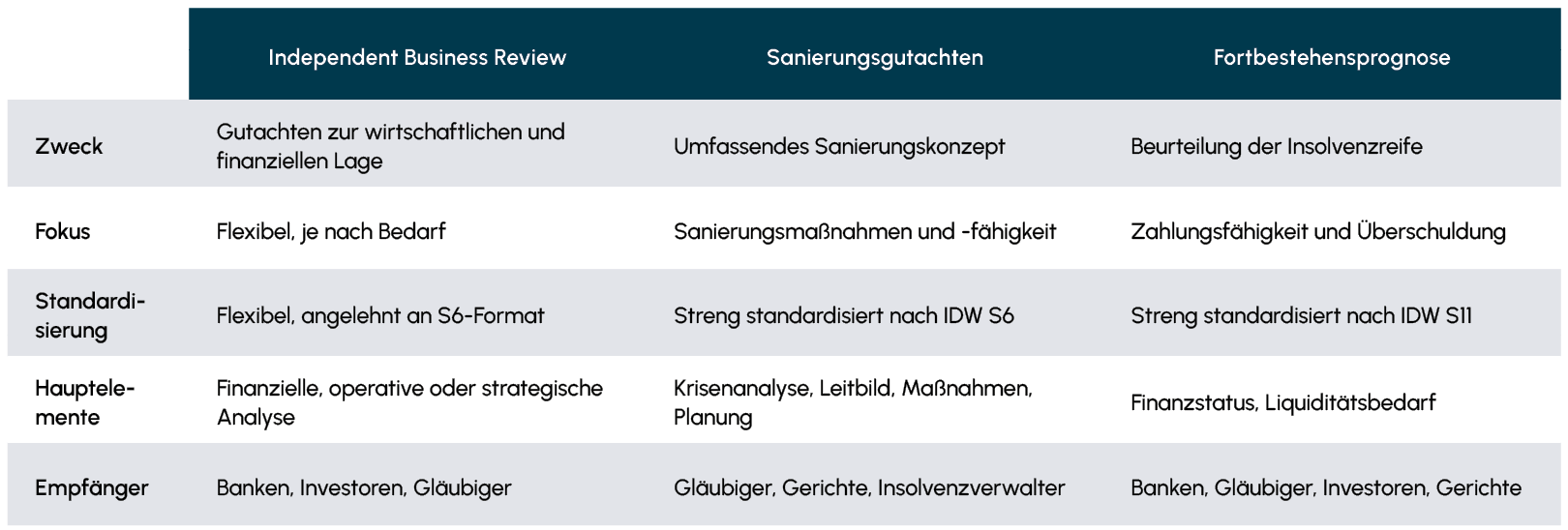 Der Hauptunterschied zwischen einem IBR, dem Sanierungsgutachten gemäß IDW S6 und einer Fortbestehensprognose gemäß IDW S11 bzw. S9 liegt in der Zielsetzung und dem Umfang der Analyse: