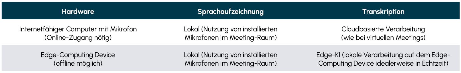 Ferner ist die Anwendung dieser KI-basierten Möglichkeiten auch nicht nur auf virtuelle Meetings beschränkt. Bei physischen Meetings bestehen in Abhängigkeit davon, ob ein Online-Zugang besteht und welche Hardware eingesetzt wird, folgende Optionen siehe Abb.1.