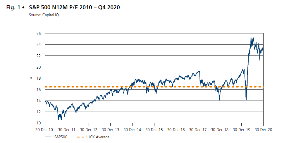 The S&P 500 ended the quarter with a price-to-earnings (P/E) ratio based on 12-month earnings expectations of 23.8x, which is below the peak of recent months but still significantly above the average of 16.5x over the past 10 years. This value is largely due to the drop in earnings expectations in the wake of the Corona cri-sis, which have fallen more sharply than prices. The renewed increase in the P/E ratio compared to the third quarter, when it was 23.0x, is due to the rise in company valuations following Joe Biden’s victory in the US elections on 03 November and the approval of the first Corona vaccines in December.
