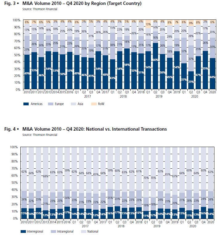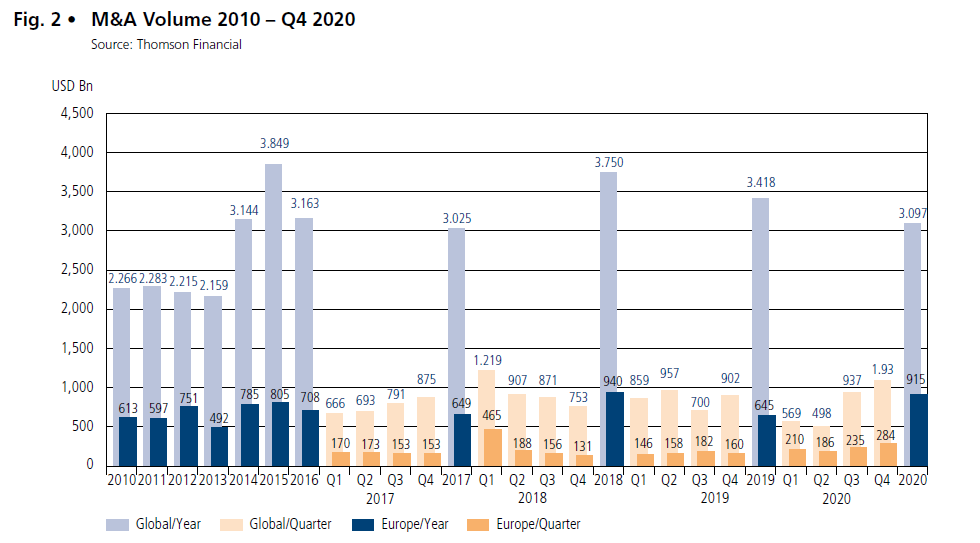 After a strong third quarter, activity in the M&A market again increased significantly in the fourth quarter. The M&A market in the Americas in particular continued to recover, but was not quite able to make up for its losses in the first half of the year, while in Europe the strongest fourth quarter since the financial crisis was recorded. It was also observed that the cross-border transaction volume increased again as well as more transactions were announced in sectors that are direct-ly or indirectly affected by the measures to combat the Corona pandemic. These could already be the first signs that companies are looking more confidently to the coming year.