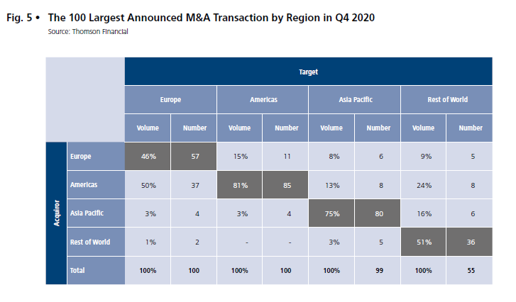 The figure below gives an overview of the 100 largest transactions per region and their distribution among the individual buyer regions. It shows that in Europe and the Americas, the target company and the buyer are from the same region in terms of volume in 46 and 81 per cent of the transactions, respectively. Compared to the third quarter of 2020, in which these values were 69 and 84 percent respectively, there was a strong shift back to interregional transactions in Europe and a slight shift in the Americas. European buyers were slightly more active in the Asian region in the fourth quarter of 2020, accounting for 8 per cent of the transaction volume compared to 1 per cent in the third quarter of 2020. Cross-border transaction volume with a European buyer and US target increased from 9 per cent to 15 per cent in the fourth quarter. American buyers’ share of total European volume increased from 30 per cent in the third quarter to 50 per cent in the fourth quarter. The percentage share of total transaction volume in Europe with an Asian buyer increased slightly from 1 to 3 per cent.
