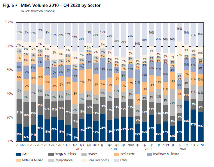 When looking at the M&A volume by sector, it is noticeable that compared to the third quarter of 2020, there was a decline in the TMT market share from 34 to 27 percent. Furthermore, a decline from 11 to 9 percent was observed in the Energy & Utilities sector. In contrast, there was a noticeable increase in the percentage shares of the Finance, Real Estate and Healthcare & Pharma sectors. In the Other sector, an increase from 19 to 21 percent was also observed compared to the previous quarter. The Consumer Goods sector shows a slight decline of 3 percentage points in the fourth quarter of 2020. The market shares of the Transportation and Metals & Mining sectors remained virtually unchanged in the quarterly view.