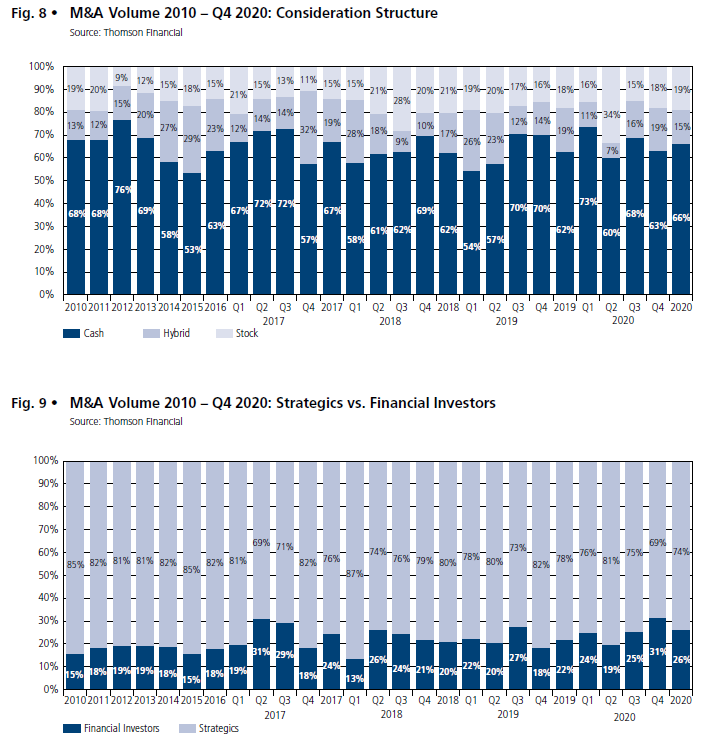 63 percent of the total transaction volume in the fourth quarter of 2020 was financed by cash, thus a decrease of 5 percentage points compared to the previous quar-ter can be observed. In contrast, the share of equities as a means of financing increased from 15 to 18 per-cent compared to the third quarter of the year. The share of transactions financed by a mix of cash and shares also increased by 3 percentage points to 19 per-cent. Looking at the annual statistics, the share of trans-actions financed with cash increased from 62 percent to 66 percent, whereas the share of transactions fi-nanced with hybrid capital decreased from 19 percent to 15 percent.