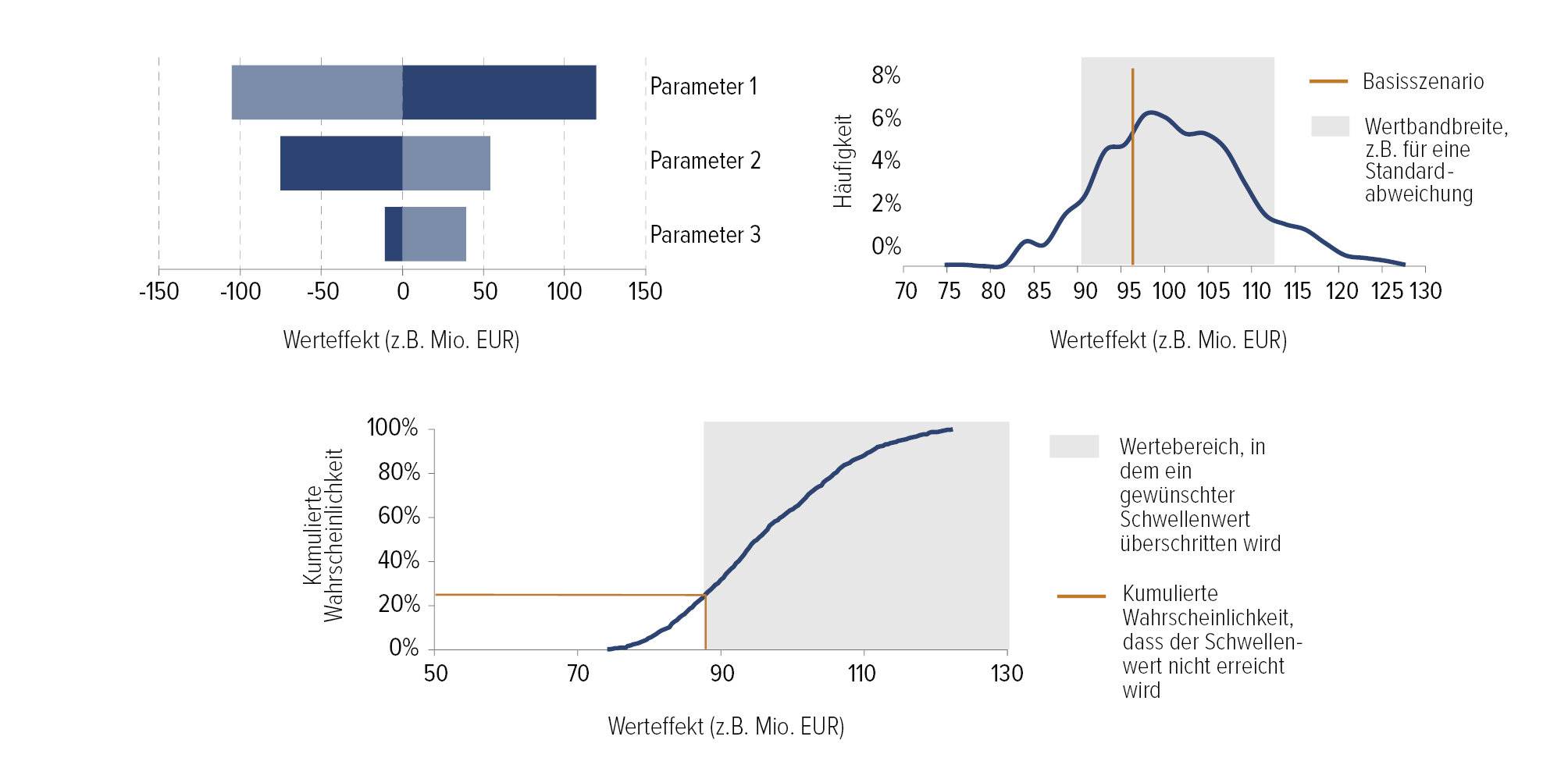 Um die immanente Unsicherheit bei der Prognose wesentlicher Businessplan-Parameter zur berücksichtigen, kann eine Analyse von Bandbreiten in Ergänzung zu Punktwerten herangezogen werden. Wenn es gelingt, wesentliche Annahmen wie den erzielbaren Medikamentenpreis, den erwarteten Marktanteil oder auch wesentliche Kostenquoten in Bandbreiten zu schätzen, kann eine Simulationsrechnung die Aussagekraft der Analysen erhöhen. Typische Ergebnisse von Simulationsrechnungen sind Tornado-Diagramme, Häufigkeitsverteilungen und kumulierte Wahrscheinlichkeiten. Alle drei Outputs sind in typisierter Form in der nachfolgenden Abbildung dargestellt. Der Erkenntnisgewinn aus einem Tornado-Chart besteht insbesondere darin, die Materialität einzelner Werttreiber auf Ceteris-Paribus-Ebene zu visualisieren und damit einen begründeten Fokus auf die Parameter mit höchster Relevanz zu legen. Häufigkeitsverteilungen können dabei helfen, jene Wertebereiche zu identifizieren, in denen sich das Transaktionsobjekt mit hoher Wahrscheinlichkeit bewegt. Das Ergebnis der Bewertung aus einem Basisszenario kann beispielsweise um die Information ergänzt werden, wie stark das Bewertungsergebnis in einem definierten Bereich um dieses Szenario herum streut. Stellen Entscheider fest, dass dieser Streuungsbereich Ausprägungen enthält, die beispielsweise im Sinne von Renditeerwartungen nicht die angestrebten Größenordnungen erreichen, kann dies eine relevante Information für den weiteren Transaktionsprozess sein. Kumulierte Wahrscheinlichkeitsanalysen eignen sich schließlich besonders dafür zu erkennen, wie wahrscheinlich das Erreichen einer bestimmten Zielausprägung ist. Soll zum Beispiel ein angebotener Preis beurteilt werden, kann diese Form der Analyse aufzeigen, mit welcher Wahrscheinlichkeit sich der erzielbare Wert ober- oder unterhalb des Preises bewegt.