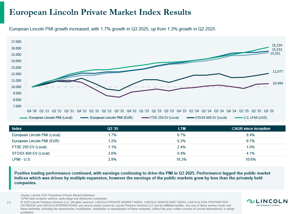 Der europäische Lincoln Private Market Index (LPMI) ist der einzige Index weltweit, der die Entwicklung des Unternehmenswerts von nicht-börsennotierten Unternehmen in Europa verfolgt. Ausgehend von einem Wert von 10.000 zum 31. Dezember 2020 stieg der Index im dritten Quartal 2025 um +1,7 %. Dies ist eine Verbesserung gegenüber der Steigerung von 1,3 % im zweiten Quartal, wobei die anhaltend positive Handelsperformance teilweise durch einen leichten Rückgang der Multiples ausgeglichen wurde.
