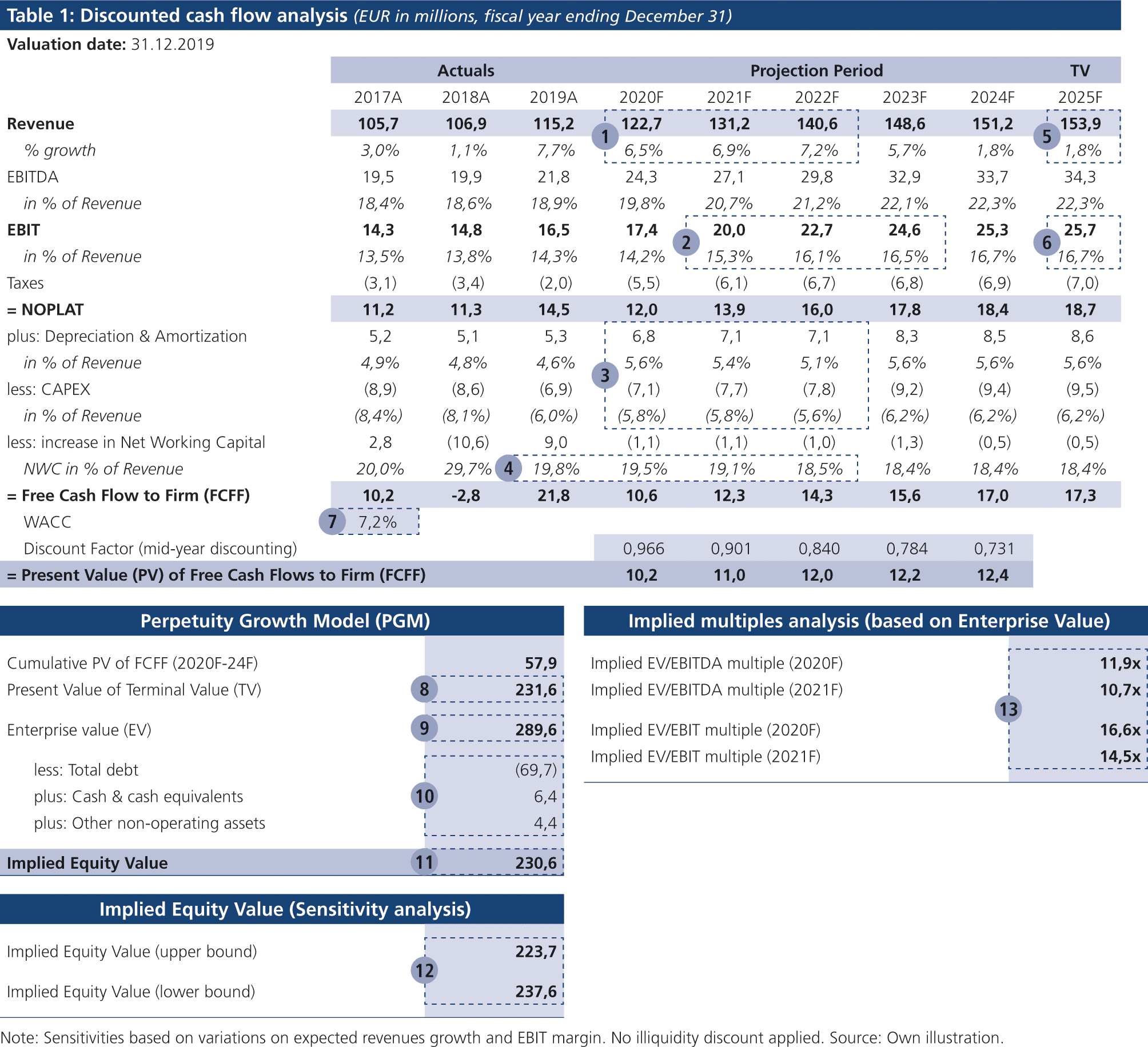 To get an initial sense of the reasonability of the DCF value conclusion, the reviewer can estimate the implied EV multiples that are reflected in the DCF value.[20. See Rosenbaum/Pearl (2013), Investment Banking, Wiley, p. 140.] To do so, he can use the enterprise value from the DCF analysis and divide it by the expected EBITDA or EBIT numbers for the first or the second forecast period. Thereafter, the implied multiples can be compared to the range of multiples observable on capital markets for comparable companies.[21. See Pignataro (2013), Financial Modeling and Valuation, Wiley, pp. 383-385.] The authors recommend projected performance figures and not actual ones for calculating implied multiples, as actuals can be distorted by material one-off items (for the valuation subject and peer firms). This surely can also hold true for forecasted figures, however the probability is much lower as one-off items (non-recurring items) usually emerge unplanned and should therefore most likely be not included in consensus estimates of financial analysts.[22. See Rosenbaum/Pearl (2013), Investment Banking, Wiley, pp. 47-49; Damodaran (2002), Investment Valuation, Wiley, pp. 240-244.] It needs to be added in this context however, that trading multiples represent the outcome of minority transactions on liquid capital markets. Therefore, adjustments in the form of discounts or premiums might become relevant.[23. See Pratt (2009), Business Valuation Discounts and Premiums, Wiley, pp. 1-40; Risius (2007), Business Valuation, ABA Publishing, pp. 152-162.]