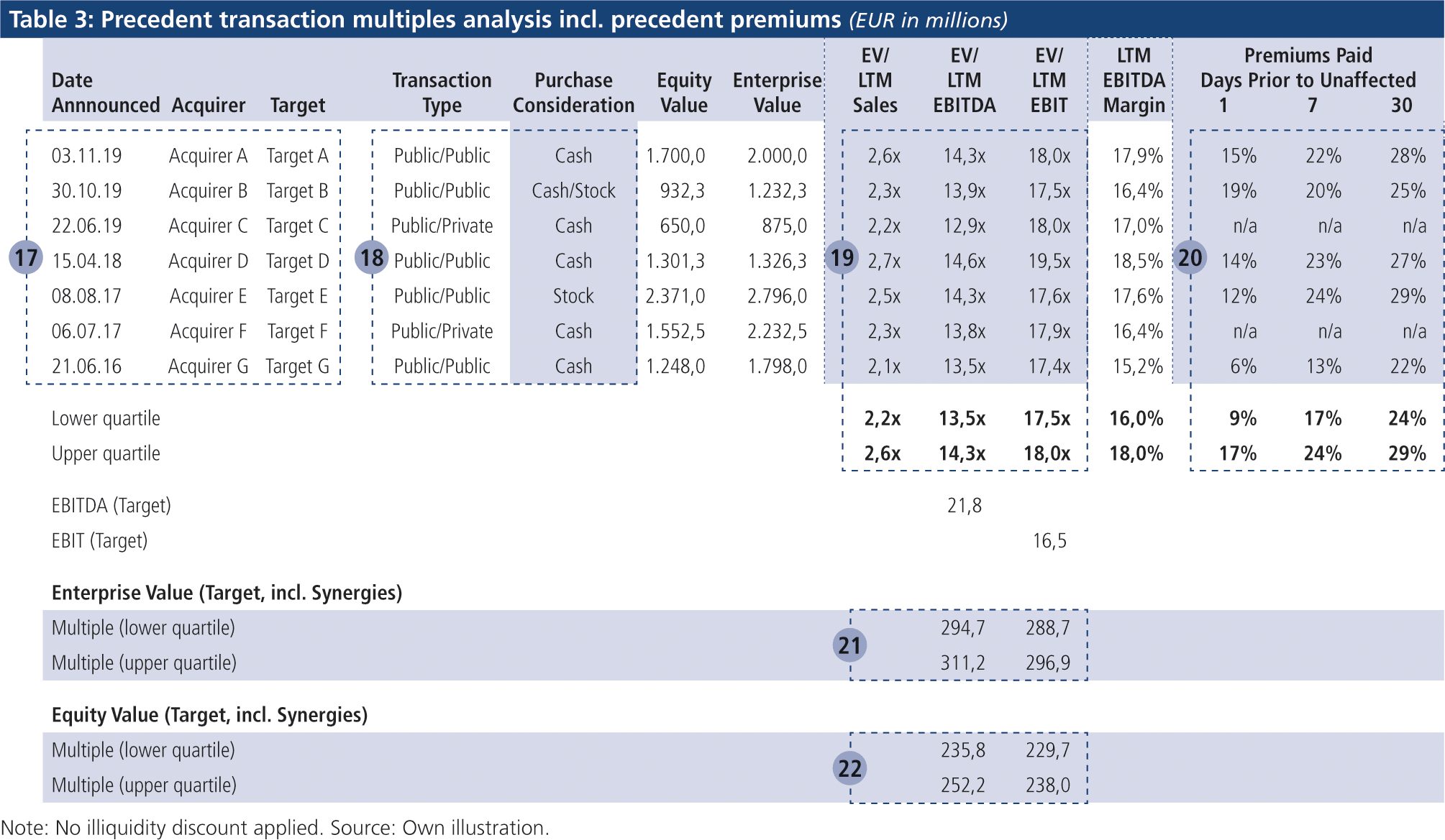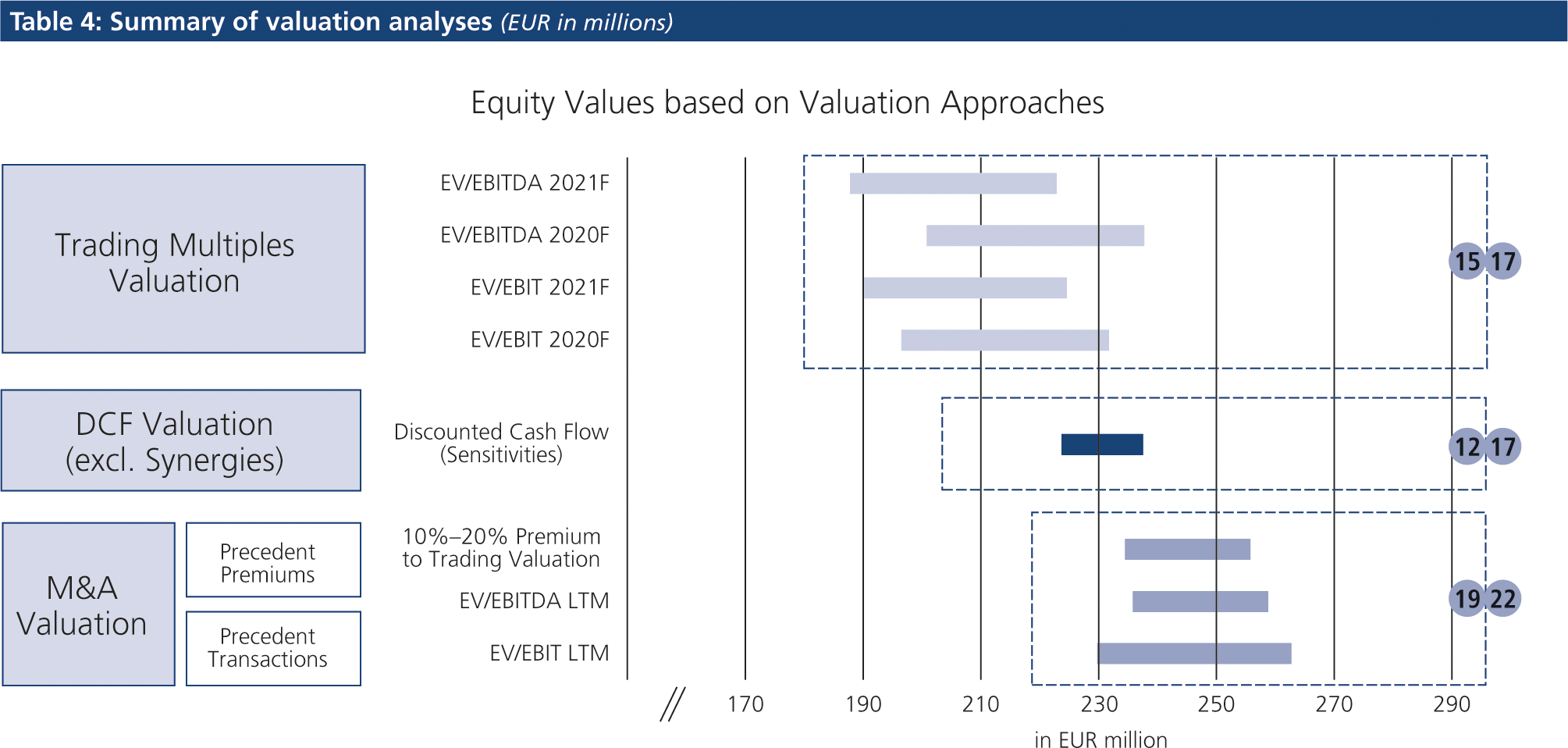 The authors highly recommend to pay close attention to the valuation results for a valuation subject derived from future cash flows (income approach) and from trading multiples (market approach) when reviewing valuation analyses. If the results from the income approach deviate materially from the results from the market approach, it raises the question of the sources for such discrepancies. Although trading multiples rather price the valuation subject and not derive an intrinsic value, results emerging from comparable companies can be used regularly as a meaningful benchmark for the income approach.[17. See Koller et al. (2010), Valuation: Measuring and Managing the Value of Companies, Wiley, pp. 313-332; Koller et al. (2005), The Right Role for Multiples in Valuation. Accessible: www.mckinsey.com/business-functions/strategy-and-corporate-finance/our-insights/the-right-role-for-multiples-in-valuation.] When reviewing valuations, the reviewer needs to understand why the enterprise value derived from the income approach is higher or lower compared to an enterprise value derived from trading multiples (like EV/EBITDA or EV/EBIT).