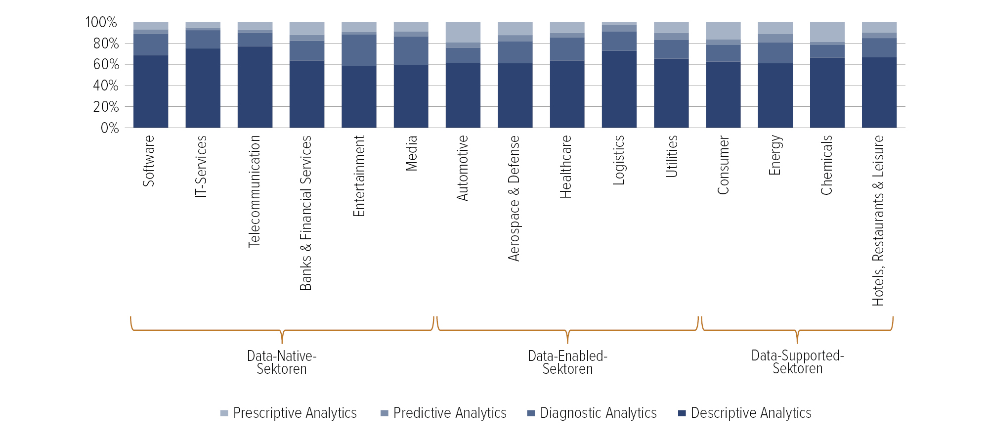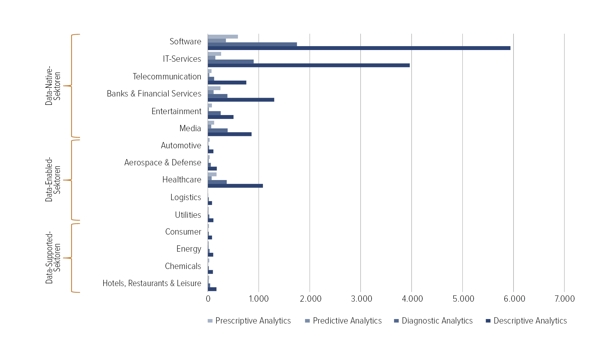 Ausgeprägt sind auch Predictive Analytics und Prescriptive Analytics in den Data-Native-Sektoren, allerdings auch teilweise in Data-Enabled-Sektoren, was darauf hindeutet, dass diese Industrien erweiterte Analysemethoden nutzen, um zukünftige Trends vorherzusagen und gezielte Maßnahmen abzuleiten. Der Softwaresektor weist ebenfalls eine signifikante Nutzung von Diagnostic Analytics und Predictive Analytics auf, was seine führende Position in der Nutzung datengetriebener Innovation unterstreicht.