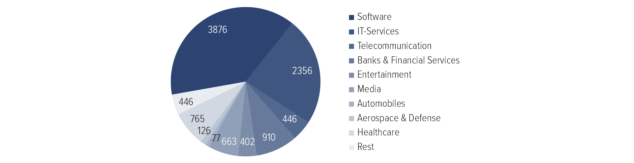 Obwohl man anderes erwarten würde, weist der Tech-Sektor eine ähnliche Kontributionsaufteilung seiner Investments auf wie andere Sektoren, zum Beispiel Entertainment. Einige Industrien weisen im Verhältnis ihrer Investitionen im Bereich Data Intelligence sogar eine höhere Fokussierung auf Prescriptive Analytics auf, siehe Automotive, als beispielsweise Software oder IT-Services. Es ist aber natürlich nicht zu vergessen, dass die totalen Zahlen eine andere Sprache sprechen, wenn die Investitionsanzahl verglichen wird, siehe Abbildung 5.