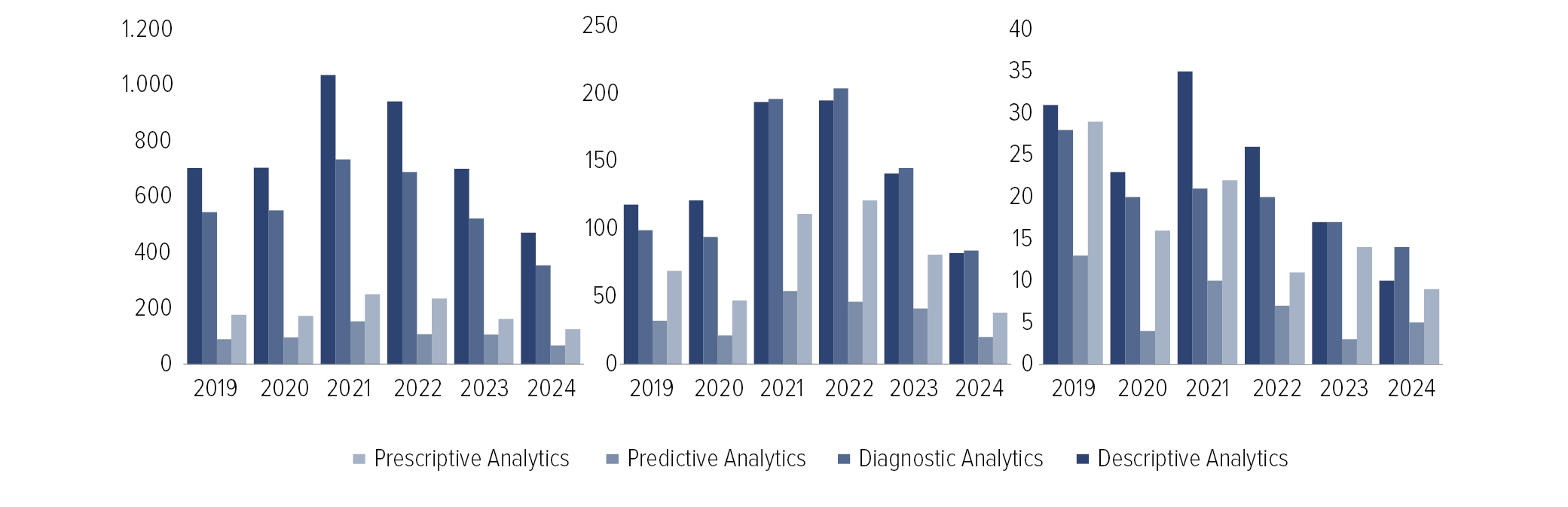 Bei einer tiefergehenden Analyse des Zeithorizonts der Investments ist ein klarer Paradigmenwechsel wahrnehmbar. Die Data-Native- und Data-Enabled-Sektoren zeigen einen klaren Shift. Während die Transaktionen in den Descriptive- und Diagnostic-Analytics-Märkten stark abnehmen, scheint die Anzahl von Transaktionen im Prescriptive-Markt relativ stabil zu sein. Wenn man dies in zeitlichen Kontext setzt, wie in Abbildung 6, ist eine zuerst erhöhte Investmentstruktur in den Jahren 2020 bis 2023 in Deskriptive und Diagnostische Analyse abzeichnend. Dadurch kann man eine aufbauende Struktur erkennen. Diese Sektoren erwarben erst die Analysewerkzeuge, um jetzt die präskriptive Entscheidungsfindung auszubauen.