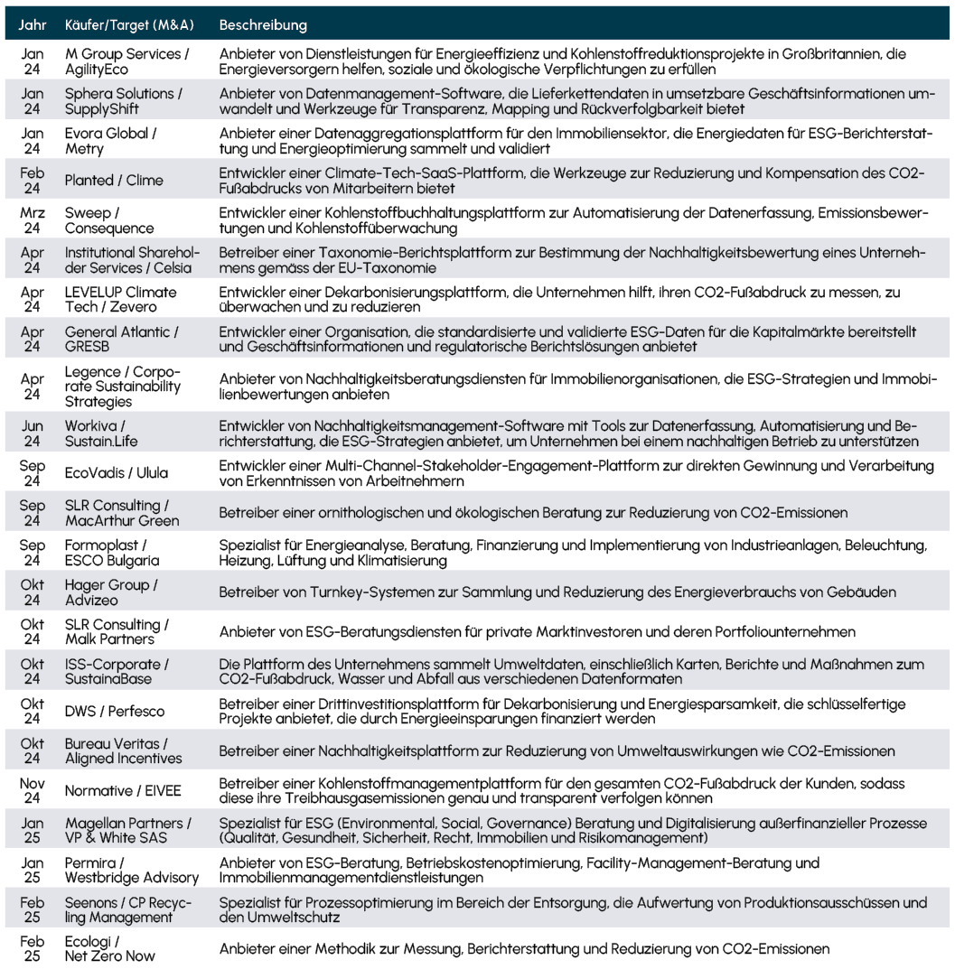 Auch der Markt von ESG-Plattformen und Beratungsdiensten selbst ist von intensiven M&A-Aktivitäten geprägt. Verschiedene Akteure konsolidieren den Markt, um eine stärkere und integrierte Plattform für ihre Kunden zu schaffen. Diese Konsolidierung zielt darauf ab, den Unternehmen, die sich den oben genannten Herausforderungen gegenübersehen, eine umfassendere und effizientere Lösung anzubieten, um ihre ESG-Ziele zu erreichen und gleichzeitig den steigenden regulatorischen Anforderungen gerecht zu werden.