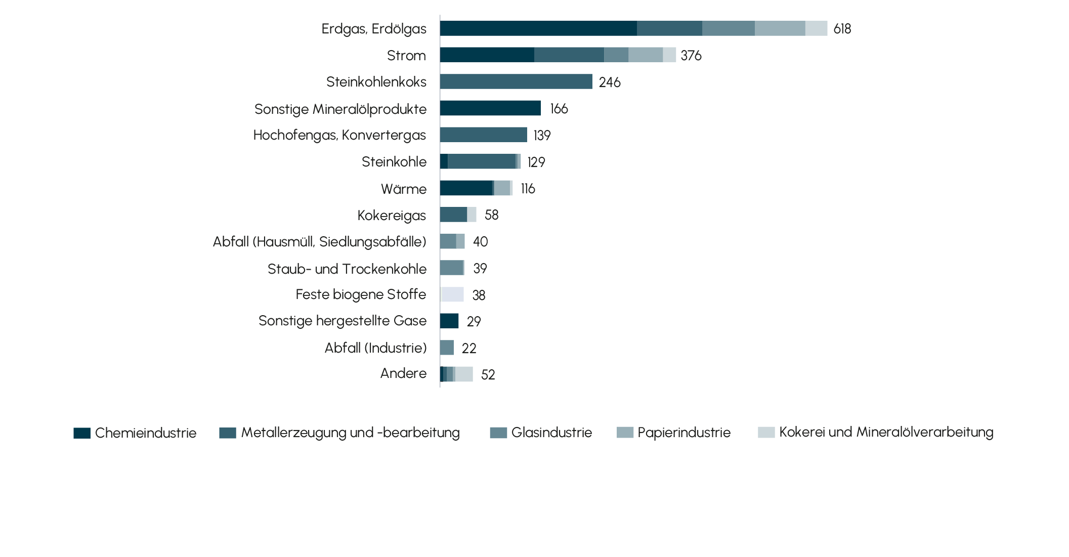 Abb. 2 Energieverbrauch der energieintensiven Industriezweige nach Energieträger in Deutschland im Jahr 2023 (in Petajoule)