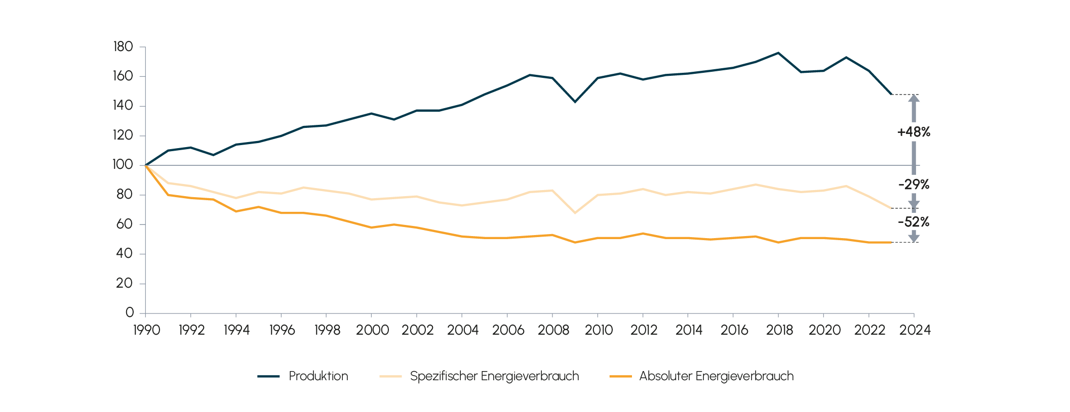 Abb. 4 Energieverbrauch und Produktion – Entwicklung in der Chemieindustrie, Index 1990 = 100
