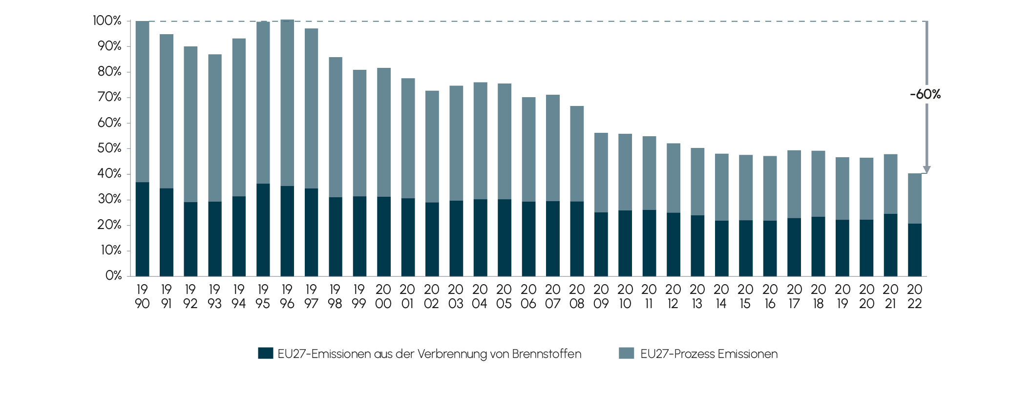 Abb. 5 Treibhausgasemissionen der chemischen Industrie in der EU, Index 1990 = 100%, 1990-2022
