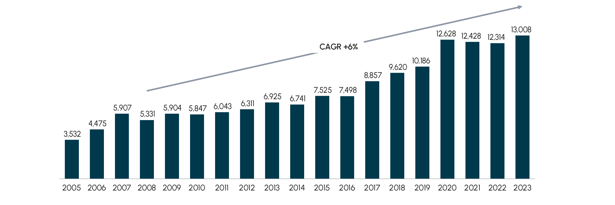 Abb. 7 Wert des ausländischen Direktinvestitionsbestands (FDI) in der EU von 2005 bis 2023 (in Mrd. USD)