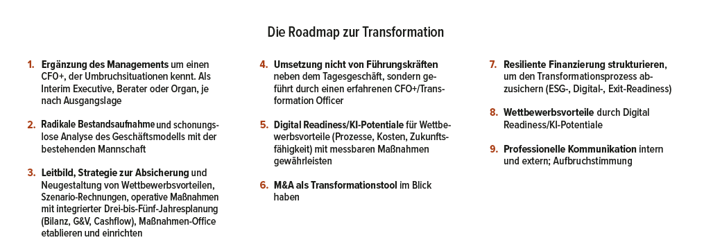 Die vielzitierte Bedeutung einer tragfähigen „Roadmap“ des Transformationsprozesses kann nicht genug betont werden. Die Erarbeitung und stringente Umsetzung einer plausiblen Change-Story, die Priorisierung von Maßnahmen und der Fokus auf ein strategisches Unternehmensziel sind die Grundvoraussetzungen für die Absicherung der Zukunftsfähigkeit des Geschäftsmodells sowie die Trendwende und das Gelingen der Mission. Sämtliche Entscheidungen und Prozesse müssen engmaschig und konsequent entlang der einmal verabschiedeten Dramaturgie des Wandels umgesetzt und regelmäßig auf ihre Funktionalität evaluiert werden.