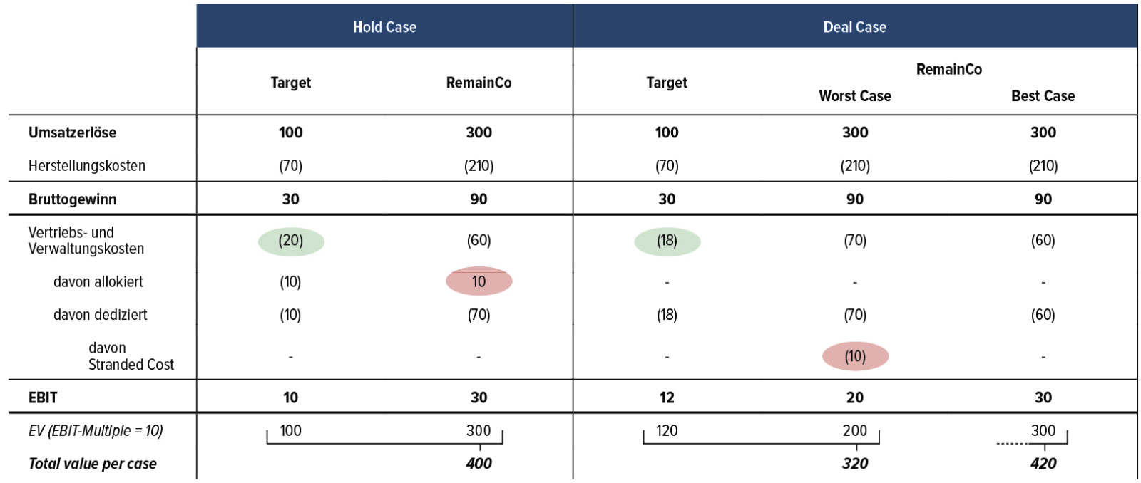 Im Deal Case werden die Allokationen beim Target durch dedizierte Kosten ersetzt. Leistungen der Mutter müssen zukünftig durch eigene Ressourcen erbracht werden. Wir gehen bei der Vorbereitung einer Transaktion in der Regel so vor, dass das Target zunächst „fully stand-alone“ gestellt wird, damit sowohl Strategen als auch PEs ausgehend von dieser einheitlichen Basis spezifische Synergien beziehungsweise inkrementelle Wertsteigerungen einrechnen können. Insgesamt kann dies bereits stand-alone aufgrund von „Delayering“ zu Einsparungen führen (z.B. Entfall von Umlagen für Konzern-CFO). Es kann aber auch zu Kostenanstiegen kommen, da Skaleneffekte entfallen. Für den Beispielfall anbei gehen wir von einer Reduktion der vormals allokierten Kosten um 20% aus, was im Einklang mit Beobachtungen aus unseren Projekten steht.