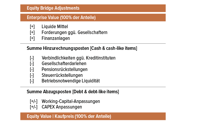 Die Berechnung des Unternehmenswerts erfolgt auf Basis des „debt- and cash-free“-Konzepts, also ohne Berücksichtigung der Bilanz-/Kapitalstruktur des Unternehmens. Für die Berechnung des Kaufpreises werden vom Unternehmenswert in einer Überleitungsrechnung, der sogenannten „Equity Bridge“, die Nettofinanzverbindlichkeiten/-forderungen abgezogen bzw. hinzugerechnet.
