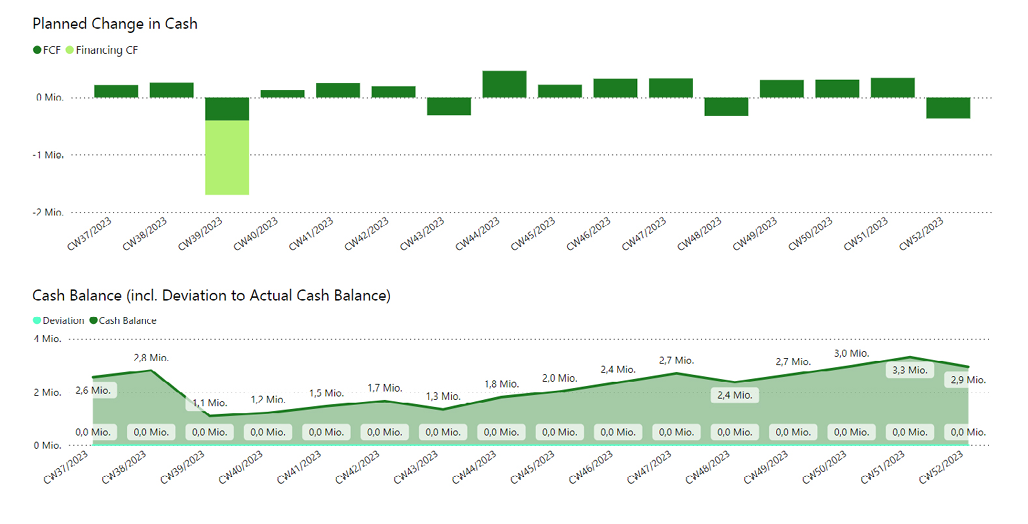 Quelle: Anonymisierte exemplarische automatisierte 13-Wochen-Liquiditätsplanung auf Basis von Buchhaltungsdaten aus DATEV sowie einem in Excel erstellten Budget-Template.