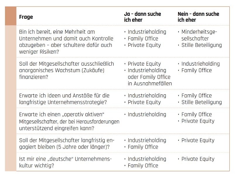 Die Tabelle dient lediglich einer ersten generellen Einschätzung. Jeder potenzielle Mitgesellschafter, ob Industrieholding, Family Office oder Private Equity, sollte sich intensiv mit der Situation des Unternehmens und auch der Lebensplanung des Gesellschafters auseinandersetzen und in einem gemeinsamen Prozess die Ziele und den Weg zu der idealen Partnerschaft definieren. So wird das Lebenswerk des Familienunternehmers mit dem Partner krisensicher aufgestellt, weiterentwickelt und erfolgreich fortgeführt, und auch seinen privaten Zielen kommt der Unternehmer so einen Schritt näher.