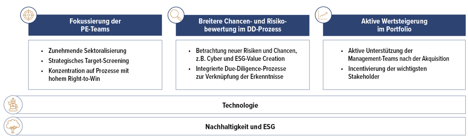 Jedes Small- und Mid-Cap-Private-Equity-Haus reagiert auf diese Herausforderungen anders. Dennoch kristallisieren sich drei wesentliche Handlungsfelder heraus, die besonders erfolgreiche Häuser konsequenter umsetzen als andere: Fokussierung, breitere Chance- und Risikobewertung im DD-Prozess und aktive Wertsteigerung im Portfolio. Technologie und Nachhaltigkeit werden in allen drei Handlungsfeldern beständig relevanter.