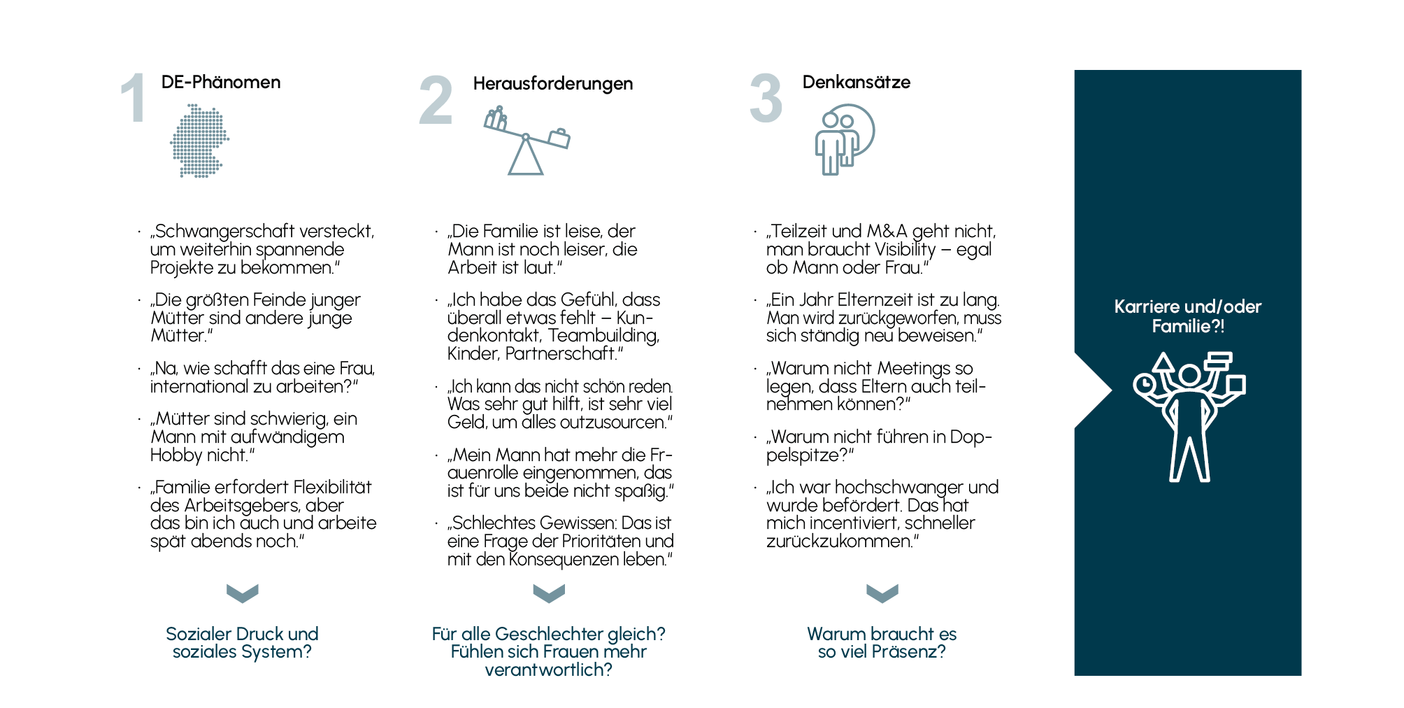 Die zentralen Bewältigungsstrategien der Interviewten sind Organisation, viel Geld und der richtige Partner. Eine Director M&A eines Automobilkonzerns sagt: „Mein Mann kann unsere Tochter holen – das hält mich im Job.“ Dabei entstehen nicht nur „Mom Guilt“, sondern ganz allgemein Schuldgefühle aus dem Anspruch, allen Rollen gerecht zu werden: „In der Theorie könnte ich überall mehr machen – für die Kinder da sein, für meinen Mann, für mein Team, Kundenkontakte intensiver pflegen.“ Der Versuch, allen Rollen gerecht zu werden, hinterlässt das Gefühl, immer irgendwo zu versagen (siehe Abb. 4 für weitere Interviewausschnitte). Mütter in M&A kämpfen nicht nur mit tradierten Rollenbildern und einem männlich dominierten Arbeitsumfeld, sondern zudem mit hohen eigenen Ansprüchen und den gesellschaftlichen Erwartungen. Frauen werden dadurch in ihrem Menschsein in Frage gestellt, wenn sie sich weniger oder nicht als Mütter engagieren, da sie quasi ihren Daseinszweck nicht erfüllen13. Selbstzweifel und mangelndes Selbstmarketing verstärken dabei die strukturellen Nachteile. Dabei sind die im Vereinbarungsmanagement entwickelten Kompetenzen wie Priorisierung, Resilienz und komplexes Erwartungsmanagement zentrale Fähigkeiten in M&A-Prozessen. Frauen, die diese Fähigkeiten täglich unter hohem Druck trainieren, bringen wertvolle Ressourcen für Führungsaufgaben mit. Ein Arbeitsumfeld, das diese Kompetenzen anerkennt und fördert, stärkt nicht nur individuelle Karrieren, sondern auch ganze Unternehmen.